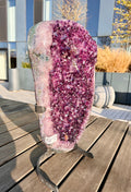 Grade AAA XL Amethyst Geode on Stand, with rare Orange Amethyst Flower and Perfect Calcite Point, Natural Rock Back, Unique Statement31.8KG