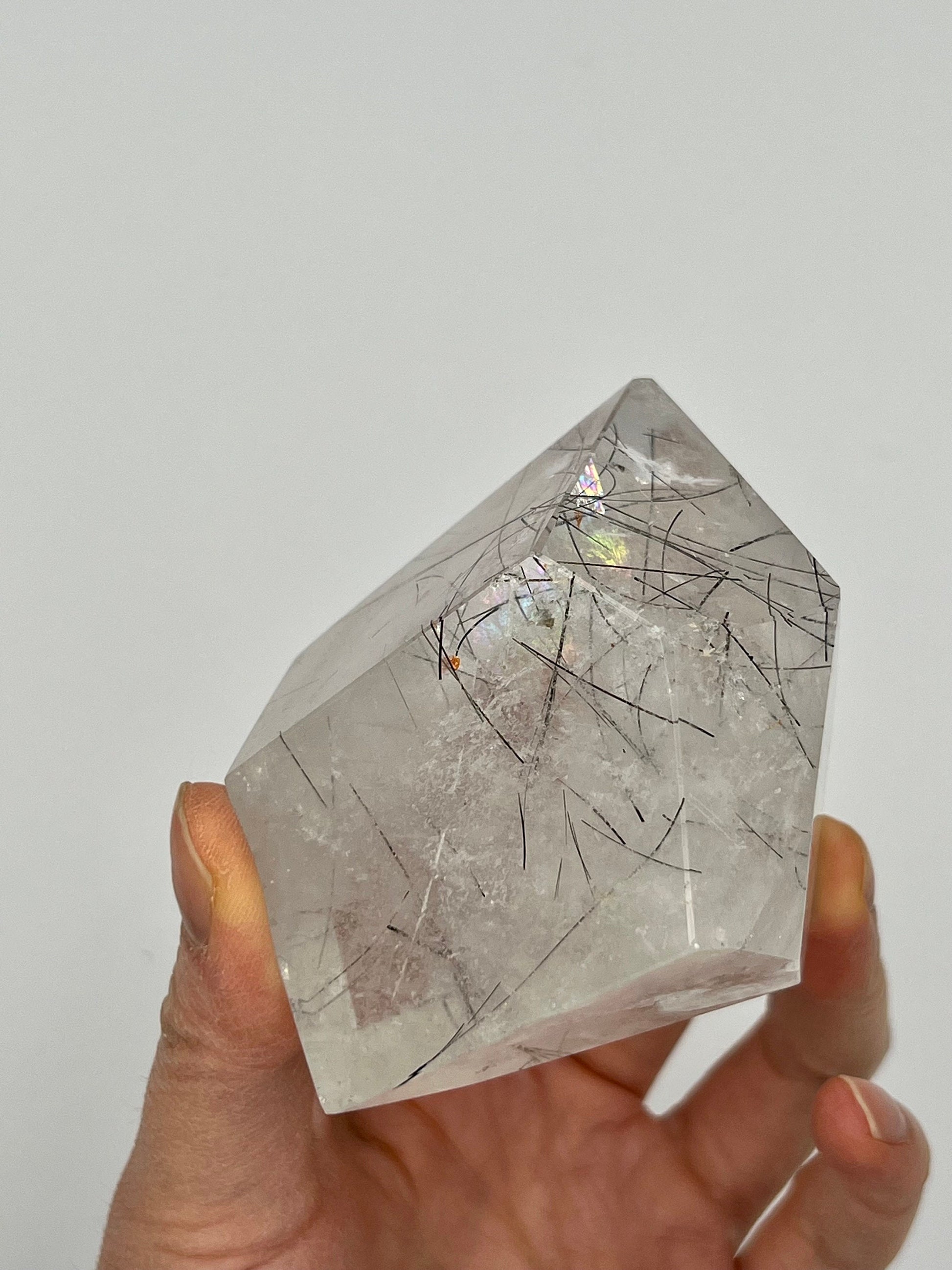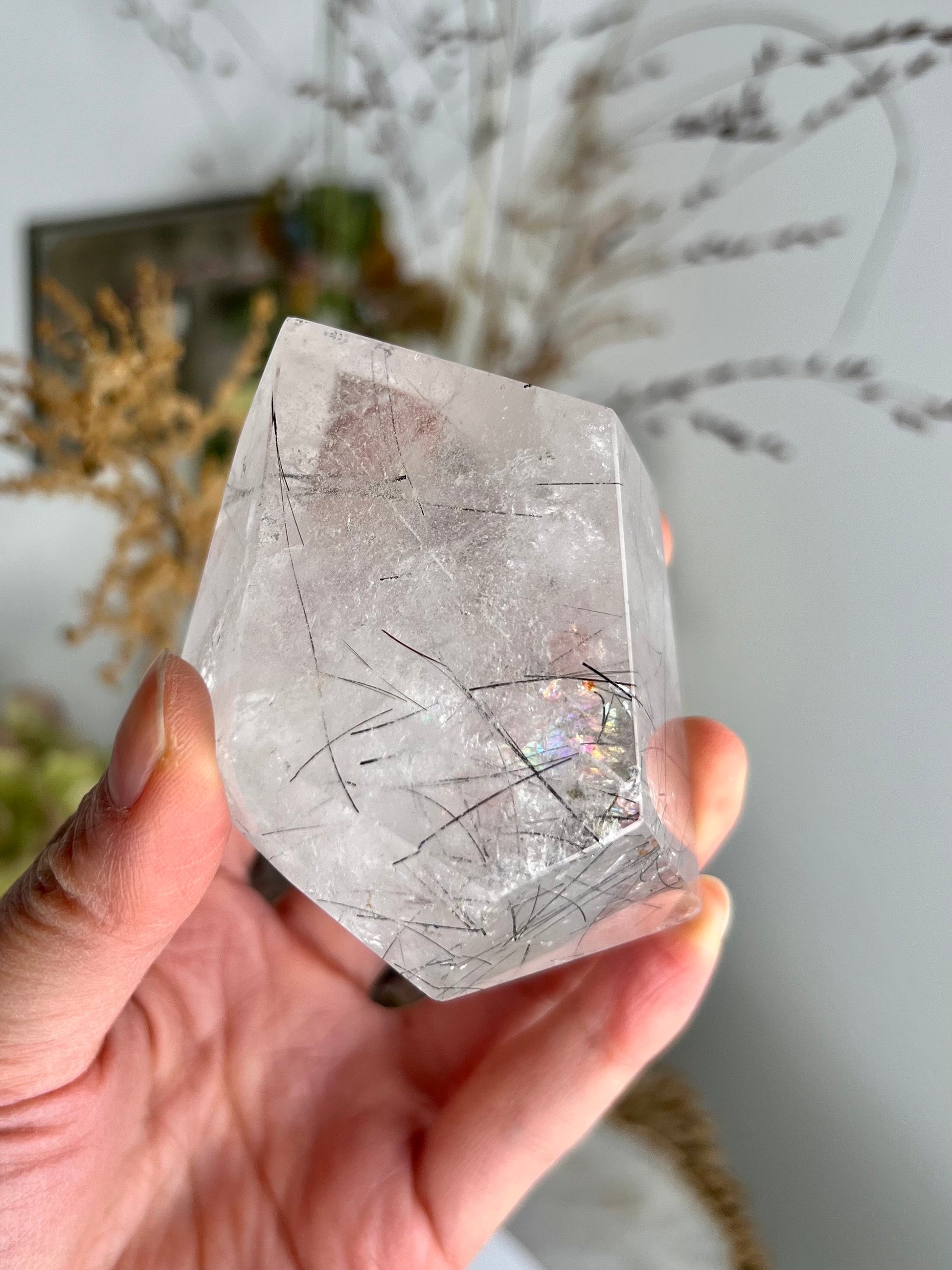 ✨ Explore the Elegance of Nature - Immerse yourself in the captivating beauty of our Natural Black Rutile Quartz Freeform. This exquisite piece showcases a prominent and vibrant rainbow, set within the mystical depths of black rutile inclusions.