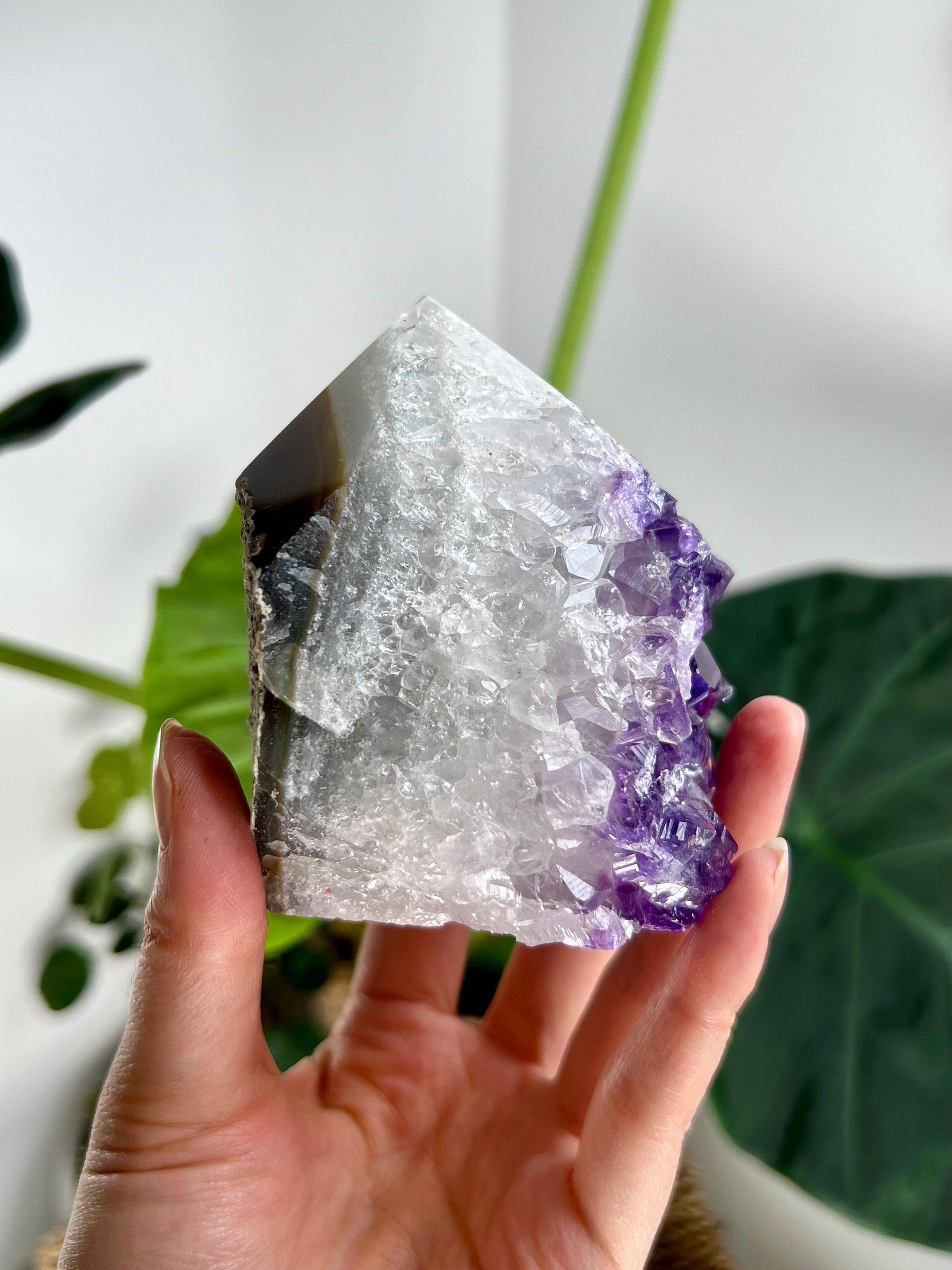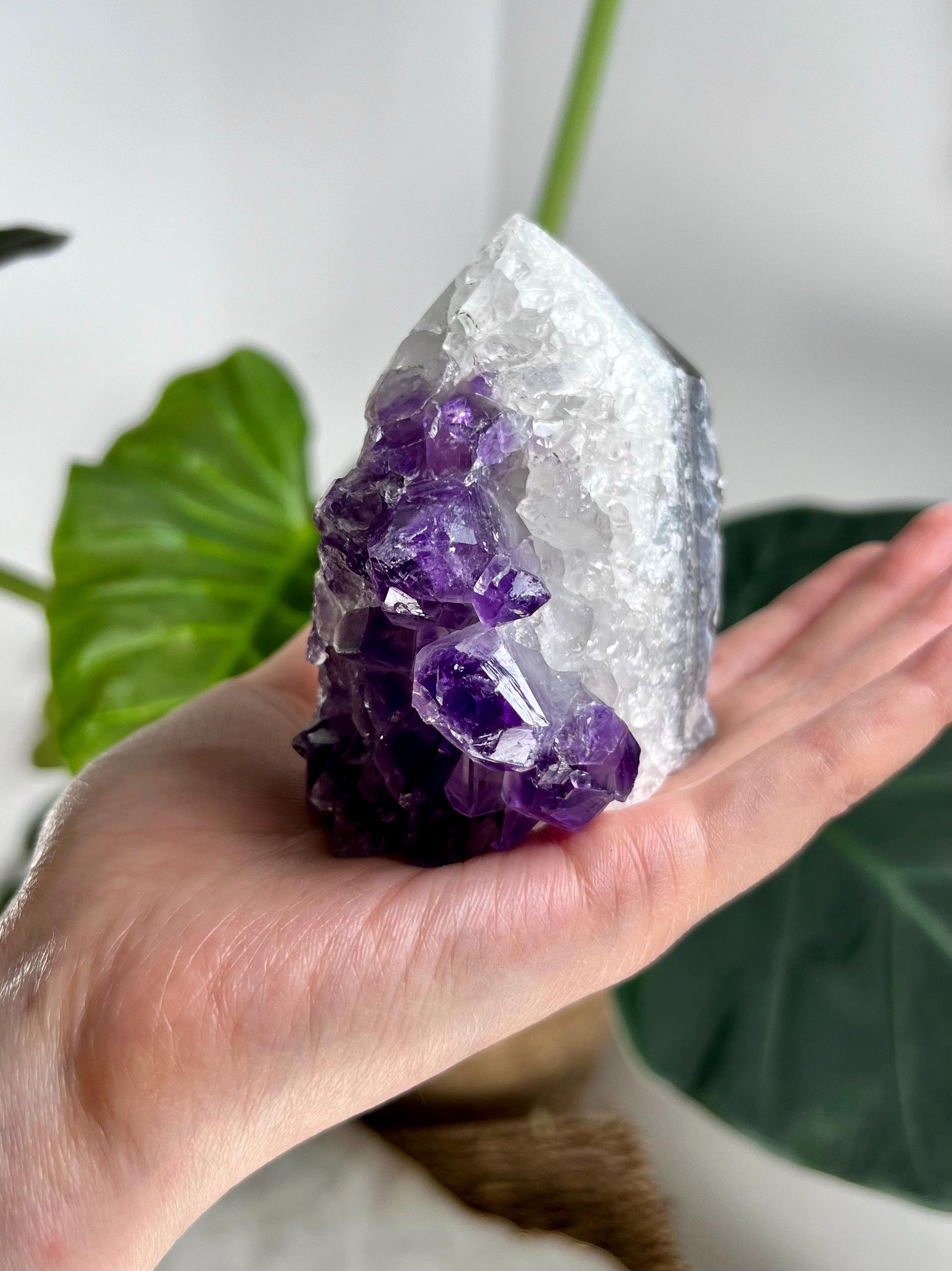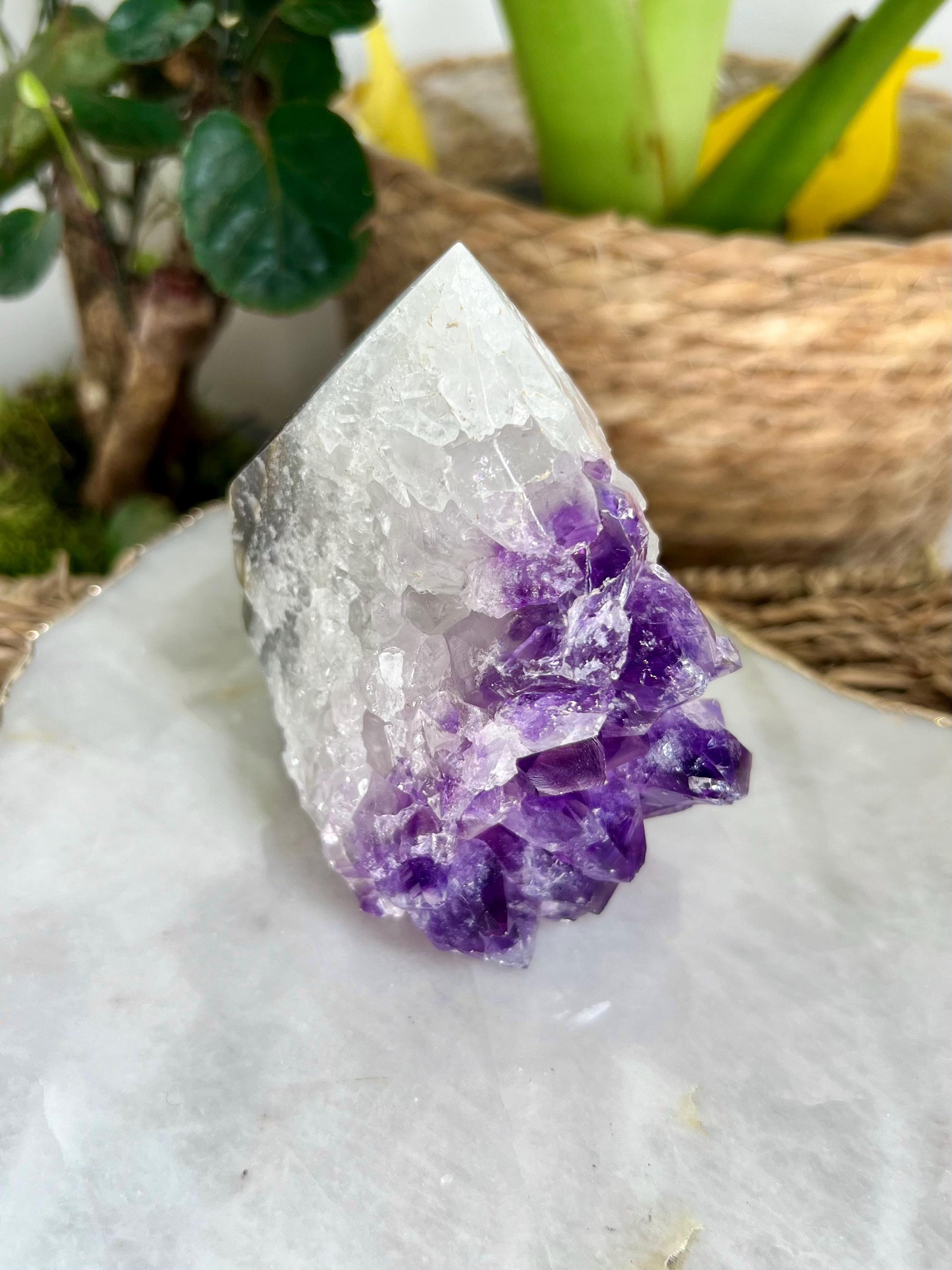 Bring the powerful, healing energy of this Natural Brazilian Amethyst Geode Tower into your home or spiritual practice today and experience the transformative power of Agate, Quartz, and Amethyst!
