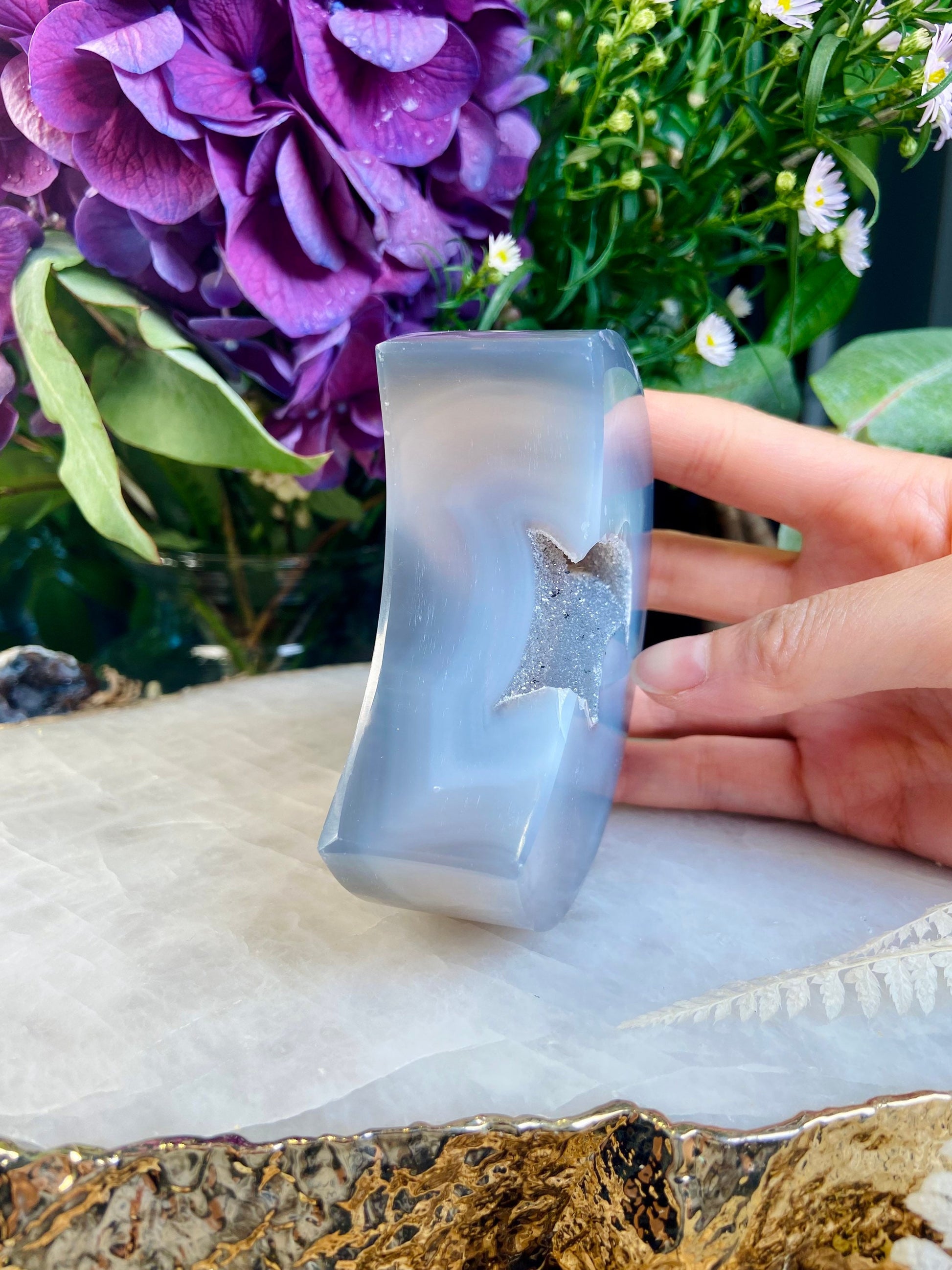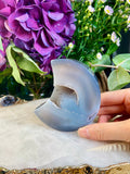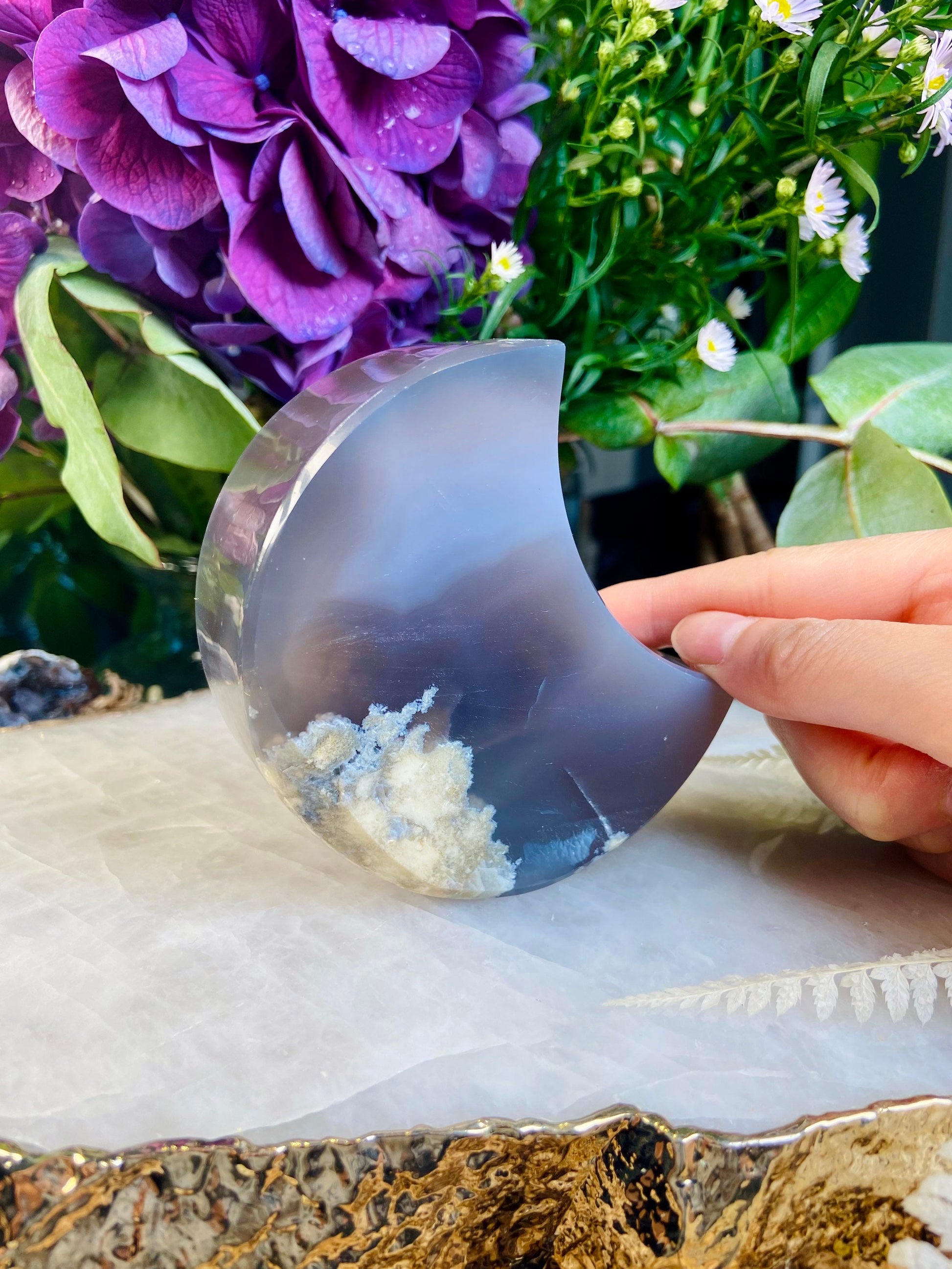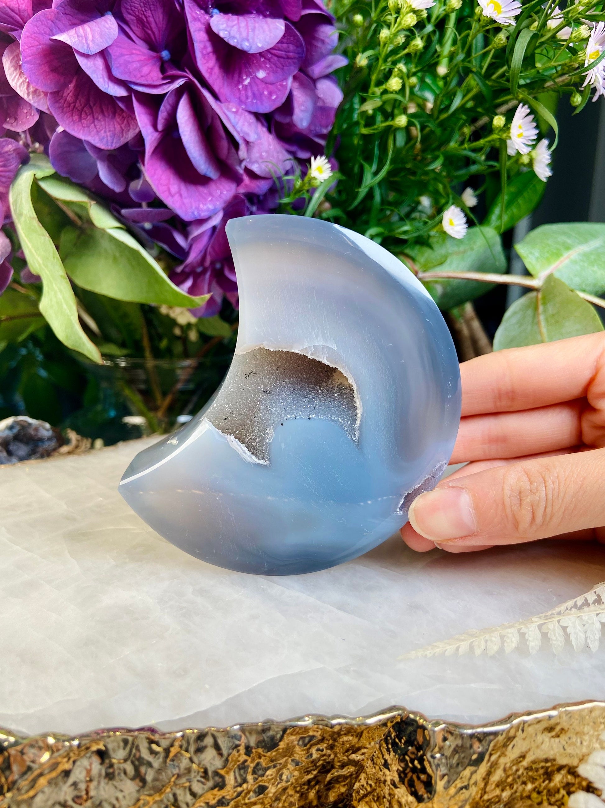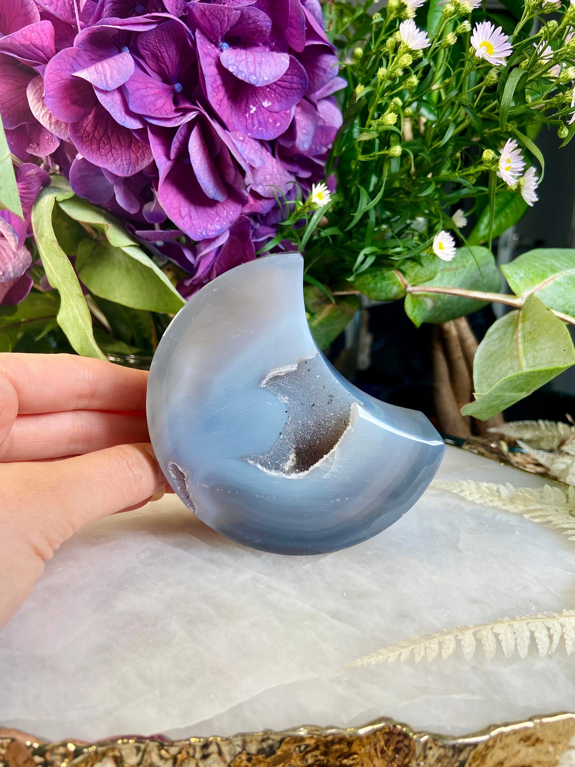 Natural Grey Agate Moon with Druzy Geode, Grade AAA+, Luna Ritual, Energy Protection, House Blessing, Balancing Stone 386g